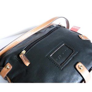 Color black with tan trim. Goldtone hardware, 3 inside pockets, one outside