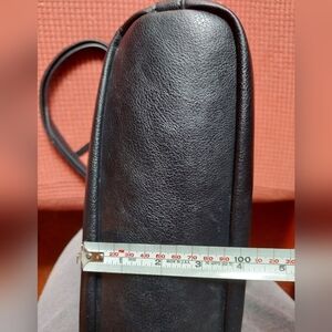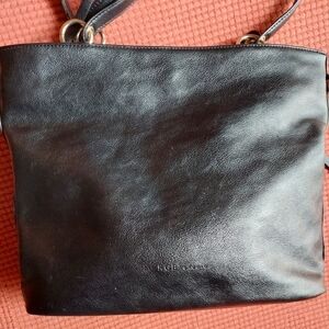 KGB Studio Black Synthetic Shoulder Bag. Front mottled exterior zippered and snap pockets. 3 inside compartments with center zippered closure. Snap closure compartments on either side.