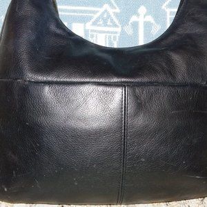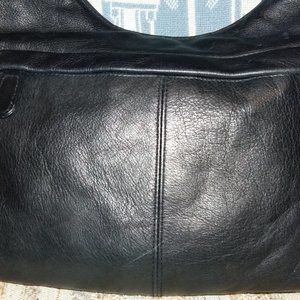 KGB - black leather purse. Rarely been used, in excellent condition. 23" strap. Front has open pouch with magnetic snap. Back has 1 zippered pouch. 1 zipper on top. Inside has 1 zippered pocket. 14"w x 9"h.