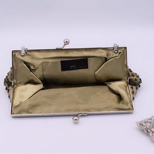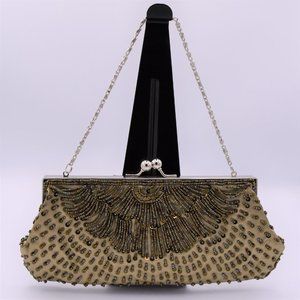 Beautiful Khaki Gold Coloured - Tri-Gold Beaded Evening Bag with Optional Shoulder Length Strap in Silver Metal.