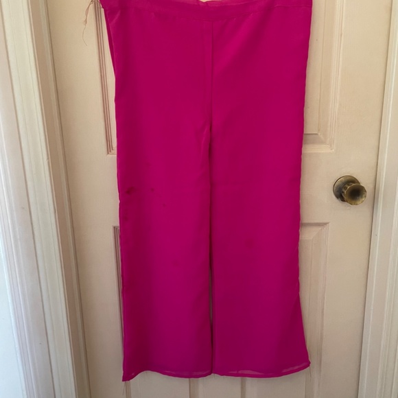 Brightly coloured pink Indian outfit, perfect for mehndi, dholkis or other events. Beautiful thread work by hand with pink beading and sequins. Outfit can be worn to various Indian events, or the top can be worn on its own as it is quite beautiful with just a pair of leggings or shorts. This listing includes 3 pieces - shirt, pants, scarf. NOTE Pants have few stains as shown in last two images - not from wear - fabric was soiled prior to outfit completion.