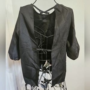Easy to wash and good quality. Only use a couple of time. Bottom elastic sleeve ending and front pocket. Open back with two cord adjustment. 5-8 years old