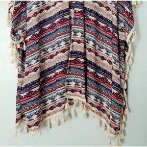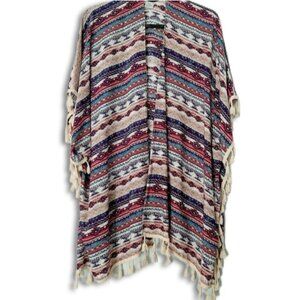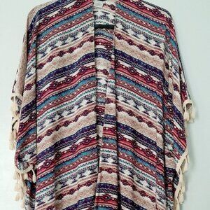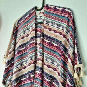 • Kimono sleeve open front lightweight fabric poncho style cardi in multicolor south western pattern and tassel trim. Great to wear as a light cardigan or beach cover-up.