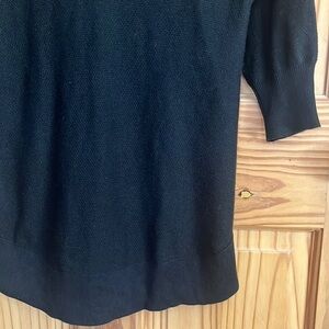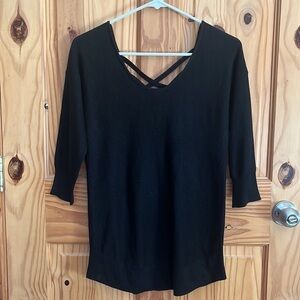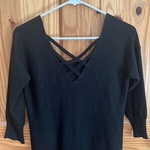 NWOT - New Without Tags Lightweight dolman sleeve sweater with strappy lattice detail at the back. Layer it with a basic tank top and your favourite jeans, and you’re ready to go. 3/4 length sleeve pullover round neck lattice detail back dolman sleeves relaxed fit 50% polyester, 35% viscose, 15% nylon