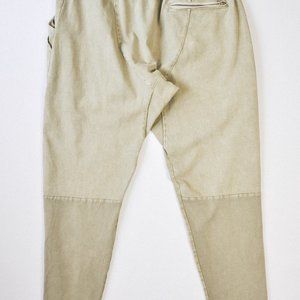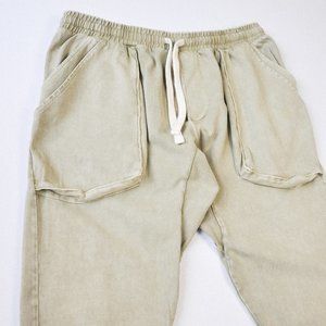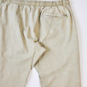 Measurements (flat lay): 19-21" elastic and drawstring waist, 25.5" hips, 11.5" rise, 34" inseam