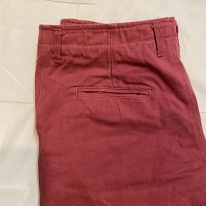 Pinkish red with contrasting grey elasticized cuffs. Logo on back belt line, zip fly, two side slanted pockets, two back pockets, 100% cotton. Made in USA