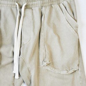 Measurements (flat lay): 19-21" elastic and drawstring waist, 25.5" hips, 11.5" rise, 34" inseam