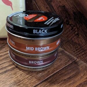 Kiwi shoe care bundle new! 3 shoe polish,. black, medium brown and brown, 1 cream black polish, brush applicator & soft buffing cloth. Everything you need to refresh your shoes before selling.