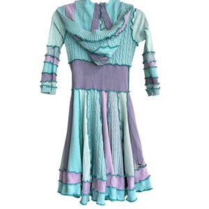 Unique KLA Originals “one of a kind” pixie patchwork coat in teal, purple, and multicolor panels. Designed with a long pointed pixie hood, flared skirt-like patchwork bottom, and detailed embroidered flowers and leaves for a whimsical fairycore vibe.