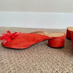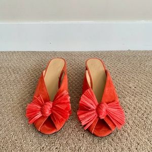 Adorable and cheerful KMB Asrid Raffia Bow mules from Anthropologie UK, size 37, EUC, worn once inside only. NOTE: There is a dark mark on the footbed of the right shoe that was present when purchased and cannot be seen when wearing. These were purchased at the George Street location in Edinburgh, Scotland and were exclusive to Anthropologie UK. They are super cute and cheerful and look great with any outfit. Paid £150 GBP ($250 CAD). From a smoke free, poodle friendly home.
