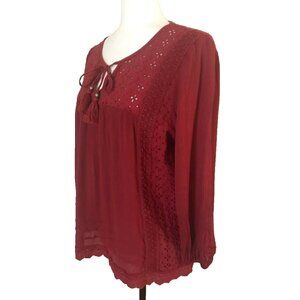 KNOX ROSE Boho Peasant Top Size Large Burgundy Eyelet Neck Tie Tassles
