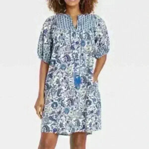 KNOX ROSE dress Puff Sleeve Blue White Bohemian Floral Tassel Tie Size S