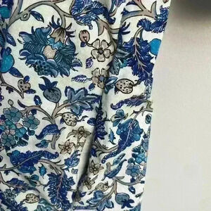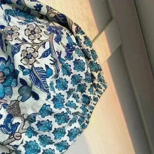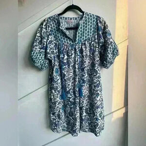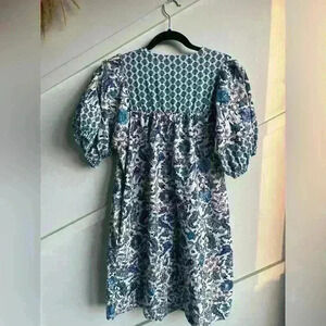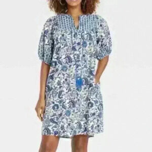 KNOX ROSE dress Puff Sleeve Blue White Bohemian Floral Tassel Tie Size S