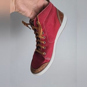 Elevate your style with these red high-top sneakers. Perfect for casual outings, these shoes offer comfort and a trendy look.