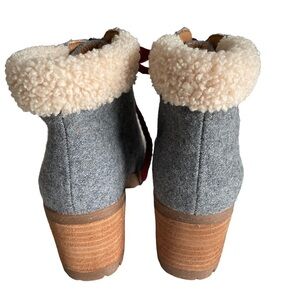 New Evie booties from Kork's. Wool uppers. Block heel with rubber lug outsole. 2.5" heel. Fully lined, cushioned insole. Faux shearling collar. Size 6