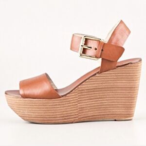 These leather wedge sandals feature a buckled ankle strap. Stacked platform and heel. Rubber sole.