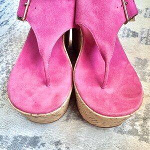 KORS Michael Kors bubblegum pink suede upper with cork platform sandals with gold buckle, size 7. Great used condition, suede has a few tiny marks that are hard to see, soles have normal wear. Fits true to size. strap with buckle is adjustable, backstrap has elastic. Cat friendly, nonsmoking home.