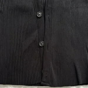 Sleek black ribbed cardigan with a V-neck. Button-front closure for easy wear. Long sleeves and a fitted silhouette. Lightweight knit ideal for layering.