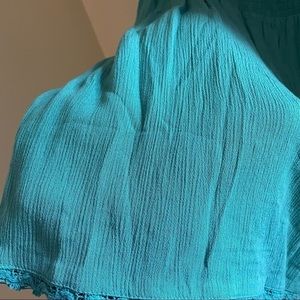 Miami Bandeau Dress, blueish green colour, This cute little bandeau dress is a must-have on your next warm-weather getaway. The blouson detail of this piece is accentuated by a delicate tie tassel intertwined with golden threads, while the bottom is finished with subtle lace trim.