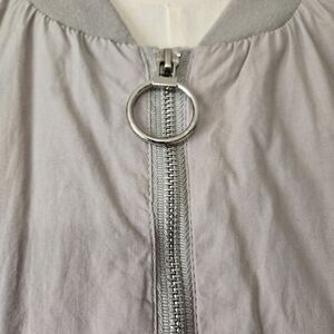 Lightweight cream bomber jacket with a unique back fold design from contemporary luxury brand Kollar. Two magnetic front flap pockets. One inner pocket. Arm zippers. Fully lined in a silky grey.