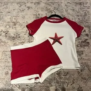 Comes w red ringer shorts (suitable for waist size 26-28), and a matching red baby tee w a printed starfish (chest size 34-36). Never worn before, small small mark (probably makeup) pictured in the last photo.
