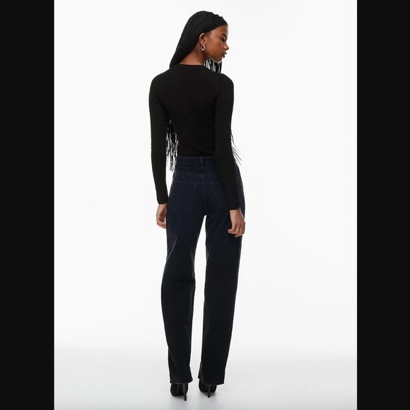 As in these jeans. These are relaxed, straight-leg jeans with a super high rise and relaxed fit. They're cut from premium European 100% cotton denim that molds to your body over time.