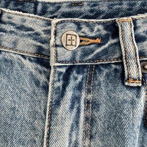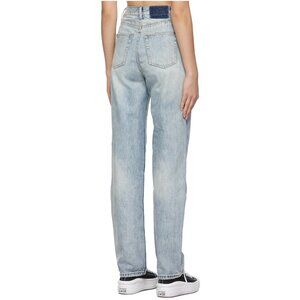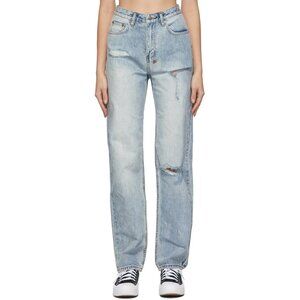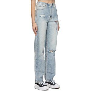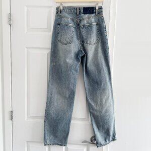 Perfectly distressed and a wear-with-everything staple, these high-rise jeans are featured in a relaxed straight-leg silhouette with statement cross-stitching and tears throughout for a vintage-inspired, lived-in look.