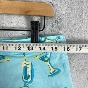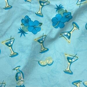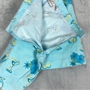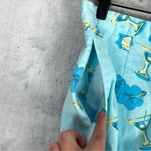 KT Golf Skort. Women's Size 14. Cotton, spandex. Slight stretch in body, none in waistband. Aqua Blue with drink and flower print. Side zipper, button close. Slit pocket on the side. Single rear button close pocket. Single darts front and back. Side slits on skirt for easy movement. Wide leg shorts with same pattern. 90s / Y2K look.