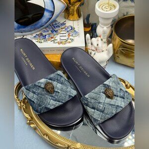🆕 KURT GEIGER LONDON 🧿 NWOB Blue Denim Meena Eagle Slides, Sz EU 38 US 7.5