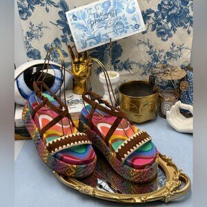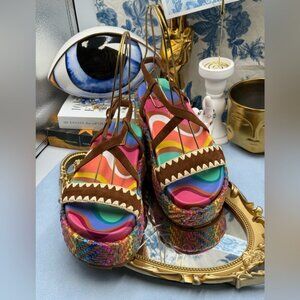 🆕 KURT GEIGER LONDON 🧿 NWOB Chelsea Flatform Sandal, Rainbow Raffia, Sz 37 US7