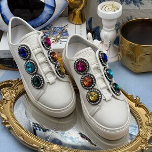 The Laney Octavia collection is the glittering jewel of British powerhouse, Kurt Geiger London. Complete with characteristic multicoloured gems, these sneakers mark the next stage in the style’s evolution. Notice how white leather has been purposely selected to make their embellishments shine even brighter. There is gold foil embossed branding at the back of the suede heel.