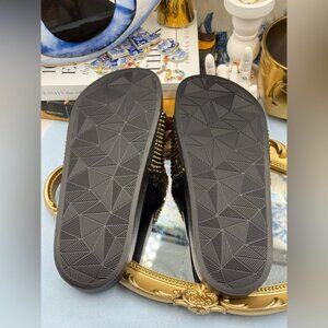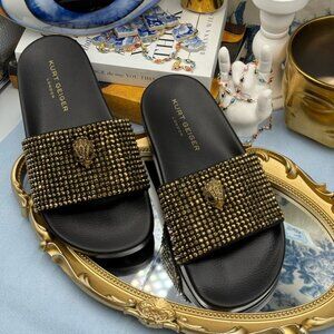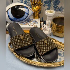🆕 KURT GEIGER LONDON 🧿 NWOB Meena Eagle Black & Gold Studded Slide, Sz 7.5