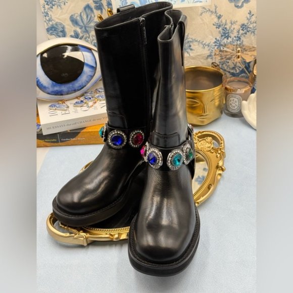🆕 KURT GEIGER LONDON 🧿 NWOB Octavia Crystal-Embellished Biker Boots Sz 37 US 7