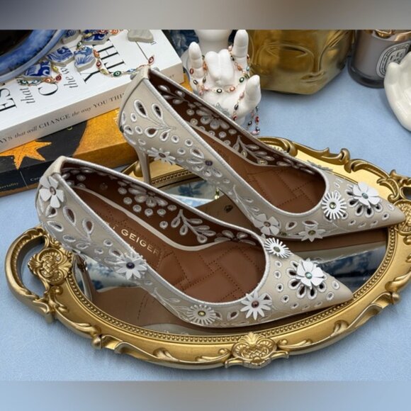 🆕 KURT GEIGER LONDON 🧿 NWOT Belgravia Flower Heel, Bone Combo - Sz 37 US 7