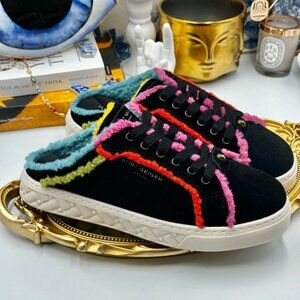 The Kensington Cupsole Mule sneaker from Kurt Geiger features a black suede upper with multi-color shearling trim and interior lining. The front laces up, there is gold foil embossed branding on the tongue and micro antiqued brass eagle head.
