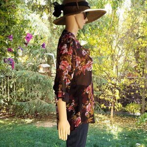 Long sleeve sheer black floral blouse (with pink, light blue and green design)