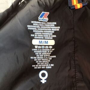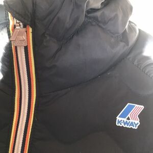 Chic black down puffer jacket by K-Way. Quilted design with hood. Front zipper closure. The zipper near the bottom has lifted slightly and needs repair.