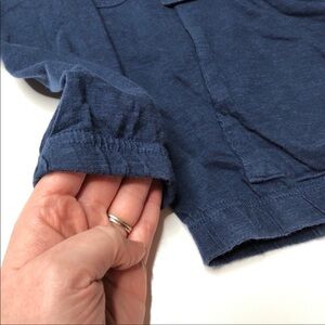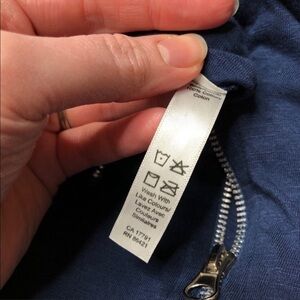 Kyodan 1/4 zip-up hoodie in a solid navy color. The front has a velcro kangaroo flip up pouch pocket. Great for running or at the gym to place your phone or ipod inside. The hem and cuffs are elastic at the bottom. The zipper hardware is silver. In excellent used condition with no flaws. Please see photos for measurements and details. Women’s size XS.