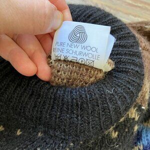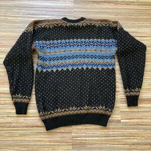 Kaare Gjose Norwegian pure wool knit sweater with a traditional knit design in blue, brown & black tones. Tag says hand wash or dry clean. Size "XL" - see below for garment measurements. Very good pre-owned condition, has a small amount of pilling from light wear.