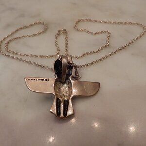 This is a genuine and rare vintage Kabana (hall marked) 925 silver (hall marked) highly detailed totem pole eagle pendant on a silver rope chain. The chain measures 18 inches in length and closes securely with a spring ring and the pendant is 1.2 inches down by 1.2 inches wide from wing tip to wing tip. It have a generous sized bail and so can be worn with almost any diameter of chain including an omega. It is in excellent undamaged condition.