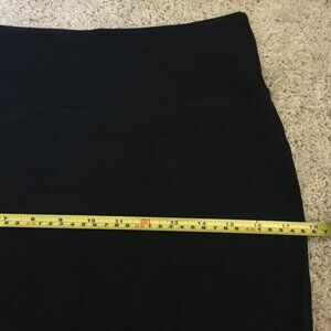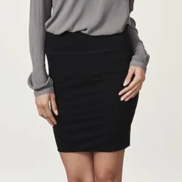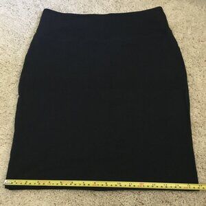 Very good preowned condition, black, stretchy, jersey pull-on 'Penny'/pencil skirt by Kaffe. This skirt is awesome and super comfortable. Stylish and perfect for summer or transition seasons. The skirt is not lined with a different fabric, but doubles so that the fabric doesn't cling. Easy to care for, durable and versatile. Prewashed by hand. Not sure how much it would shrink in the dryer (tag says 5%). 'm selling two of these skirts in different sizes: a large and extra large. This one is the large.