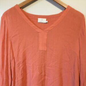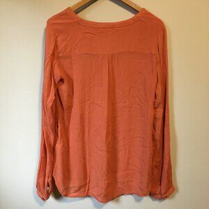 Very good preowned condition European label, Kaffe terracotta orange-coloured blouse in a crepe-like fabric. Kaffe is a European designer label that specializes in contemporary elegance. Gorgeous print and absolutely stunning shirt with details. The perfect solid colour closet staple and a beautiful colour for Fall.