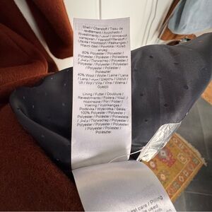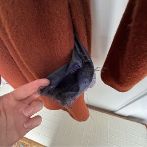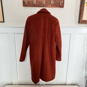 Rust brown long wool blend coat. The inside of one pocket has a hole that could easily be mended.