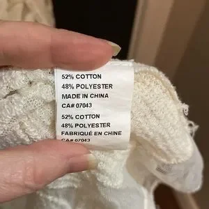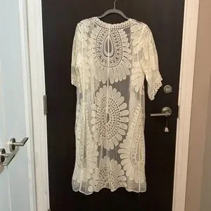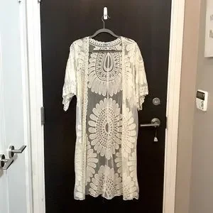 Super cute lacy cream/yellow kaftan. Great for over a bathing suit or over a tank in the summer. Sleeves are wide and fall to elbow. Doesn’t do up.