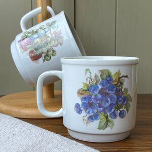 Description ๐๐ 2 vintage porcelain mugs with fruit design. The design is located on both sides of the mug. No gold accents, so the mugs are dishwasher and microwave safe.