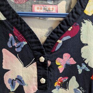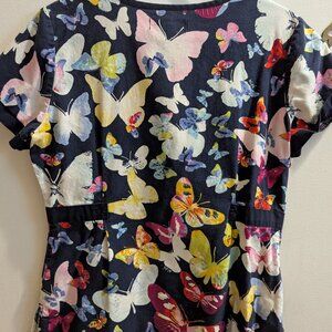 Bright and cheery butterfly 🦋 scrub top. In perfect condition. Ascents waist beautifully. Functional front pockets. Flattering V neck design with cute flower buttons.