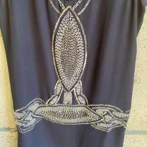 I love this top so much and would big be selling it if it still fit me and if I had places to wear it. I live in a small coastal island now with not a lot of places to go out to dressed up. This has been hand washed and is ready to find a new owner to enjoy it. 💙 It’s navy blue with silver beadwork.