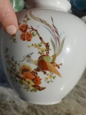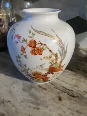 Elegant white porcelain vase featuring hand-painted orange floral blossoms and a colorful decorative bird motif. Clean white background enhances the warm orange and gold details. A refined accent piece that brings classic charm to tabletops or shelving. 7 in