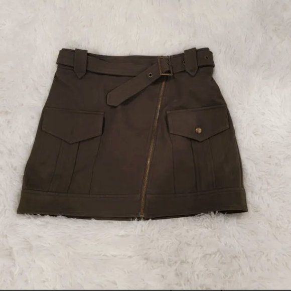 Kaki belt mini skirt Short skirt w/Exposed Diagonal Zip
