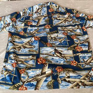 Kalaheo Men’s XL Hawaiian Shirt WWII Planes & Hibiscus Print Aloha Button EUC